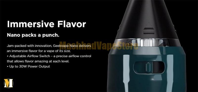 دستگاه GEEKVAPE AEGIS NANO N30 Pod ، دارای محدوده توان 5 تا 30 وات و قابلیت تنظیم دما است و تا 2 میلی لیتر ایجوس را در مخزن کارتریج خود نگه می دارد. شاسی این دستگاه از آلیاژ روی بادوام ساخته شده است، دارای استاندارد IP67 برای ضد گرد و غبار، ضد ضربه و ضد آب بودن است.