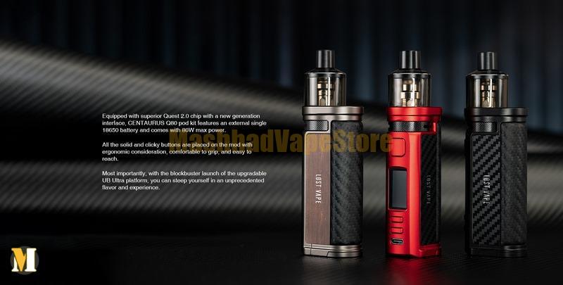 کیت پاد لاست ویپ سنتاروس Q80 با پاد UB Ultra با چیپ Quest 2.0 برتر و رابط نسل جدید مجهز شده است. این کیت ماد پاد نسبتاً سبک از باتری خارجی تک ۱۸۶۵۰ استفاده می کند که حداکثر توان ۸۰ وات را فراهم می کند. دکمه ها جامد و با در نظر گرفتن ارگونومی بیشتر قرار گرفته اند و گرفتن آسان و استفاده آسان را فراهم می کنند.