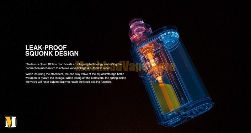 ویپ سنتاروس کوئست بی اف لاست ویپ کیت قدرتمندی است که دارای یک بطری squonk داخلی است که می تواند با مایع الکترونیکی پر شود و وقتی فشرده شود، مایع تازه را برای فتیله پنبه RDA شما می فرستد.