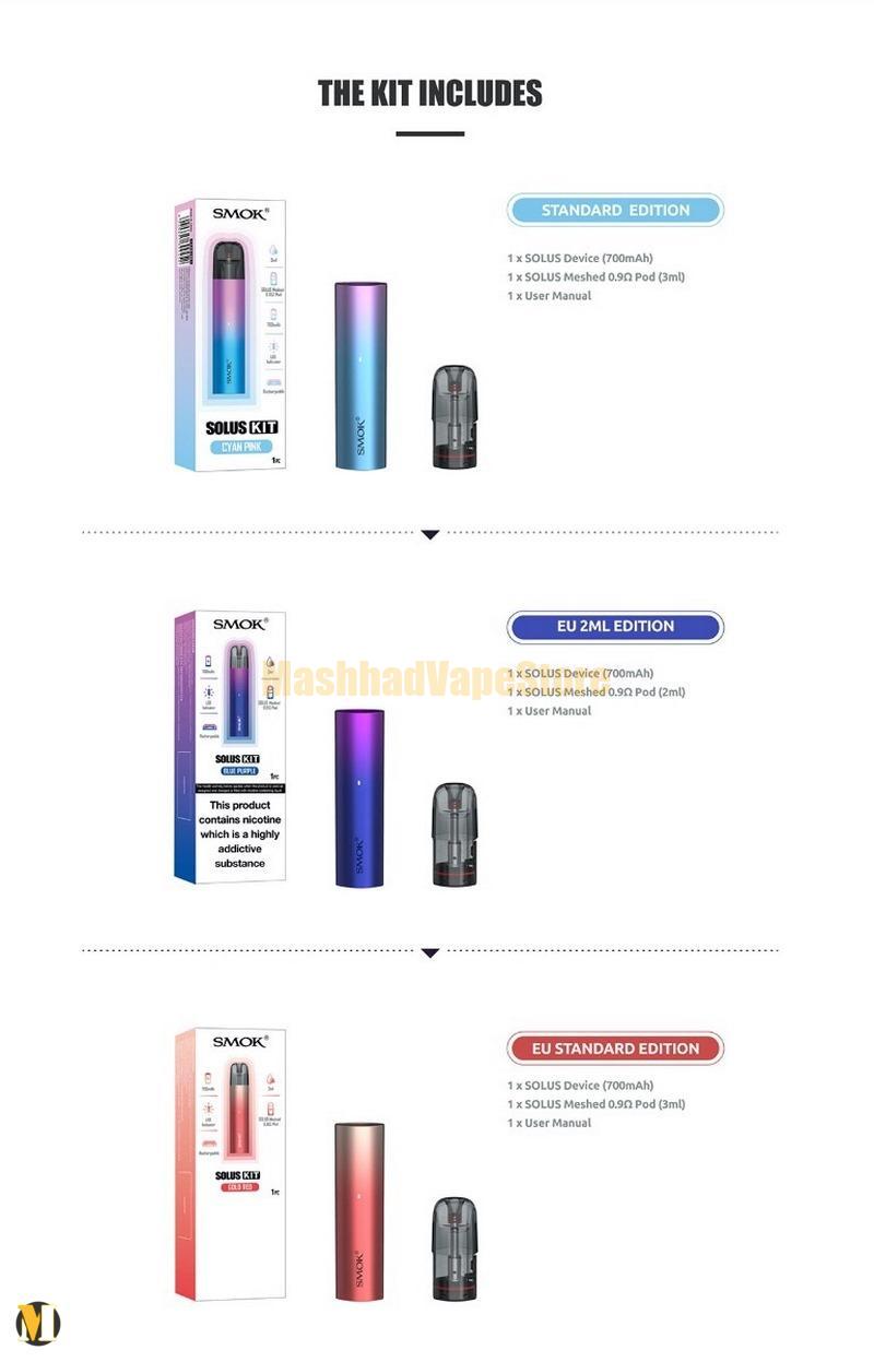 پاد سولوس اسموک می تواند یک پاد برای خانم های شیک پسند باشد که شامل یک پاد Solus با ظرفیت ۲ میلی لیتر است که دارای یک کویل ۰.۹ اُهم یکپارچه است. این بدان معناست که آن به شما یک نفس MTL (از دهان به ریه) با حسی شبیه به سیگار ارائه خواهد داد.