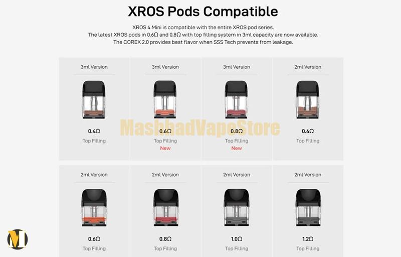 - سازگاری با تمامی کارتریجهای سری XROS: از جمله کارتریجهای ۰.۴ اهم برای طعم بهتر و بخار بیشتر.