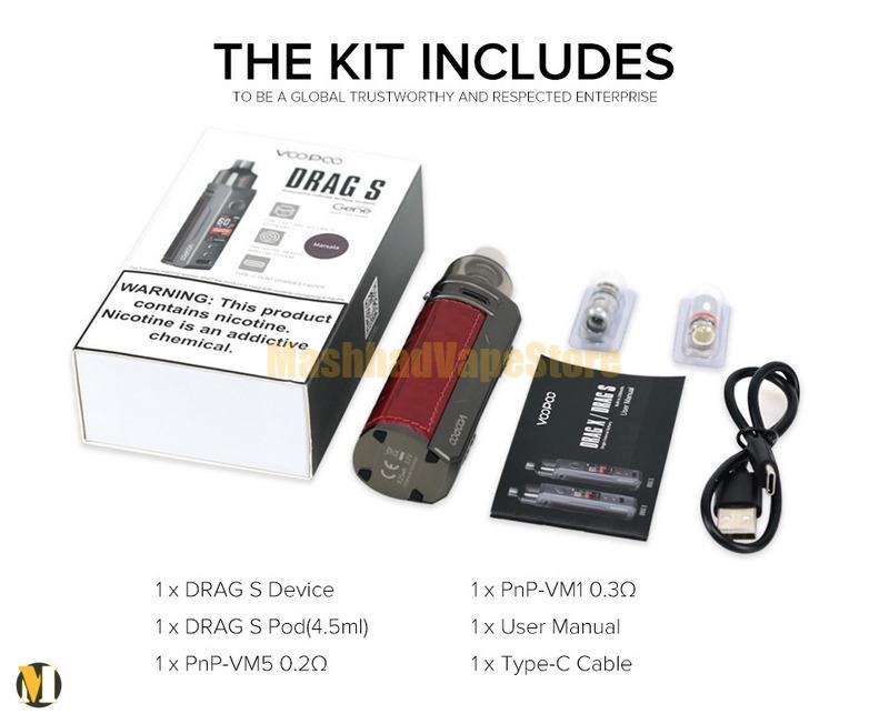 دستگاه پاد ماد VOOPOO DRAG S دارای محدوده توان 5 تا 60 وات، ظرفیت پاد 4.5 میلی لیتر و سازگاری با کویل های سری PnP کمپانی ووپو می باشد. شاسی این دستگاه از آلیاژ روی بادوام ساخته شده است و دارای یک باتری داخلی 2500 میلی آمپر بوده که از طریق پورت تایپ سی قابل شارژ است.