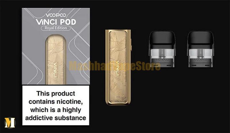 دو غلاف در بسته بندی وجود دارد: غلاف مش ۰.۸ اهم و غلاف مش ۱.۲ اهم. علاوه بر این، VINCI Pod Kit Royal Edition با کارتریج Vinci Q، Drag Nano 2 و Vinci Pod سازگار است. دارای چراغهای نشانگر LED 3 رنگ برای نشان دادن عمر باتری است.